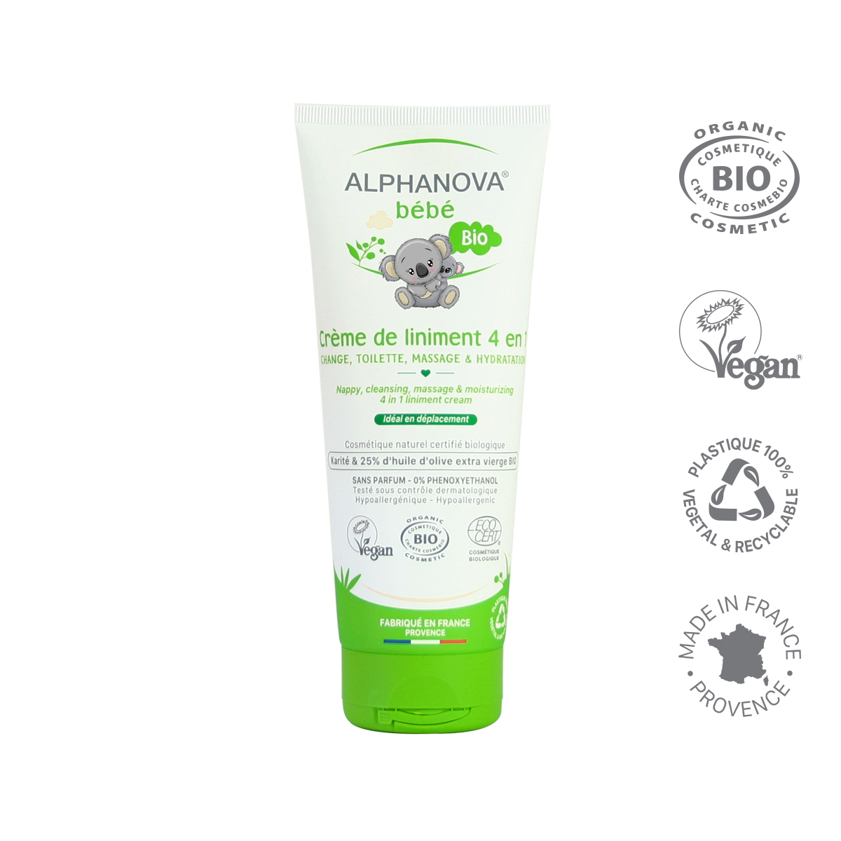 La crème liniment ALPHANOVA ORGANIC Baby® 4 en 1 est un traitement naturel, certifié vegan, bio, innovant, pratique et économique à usages multiples.