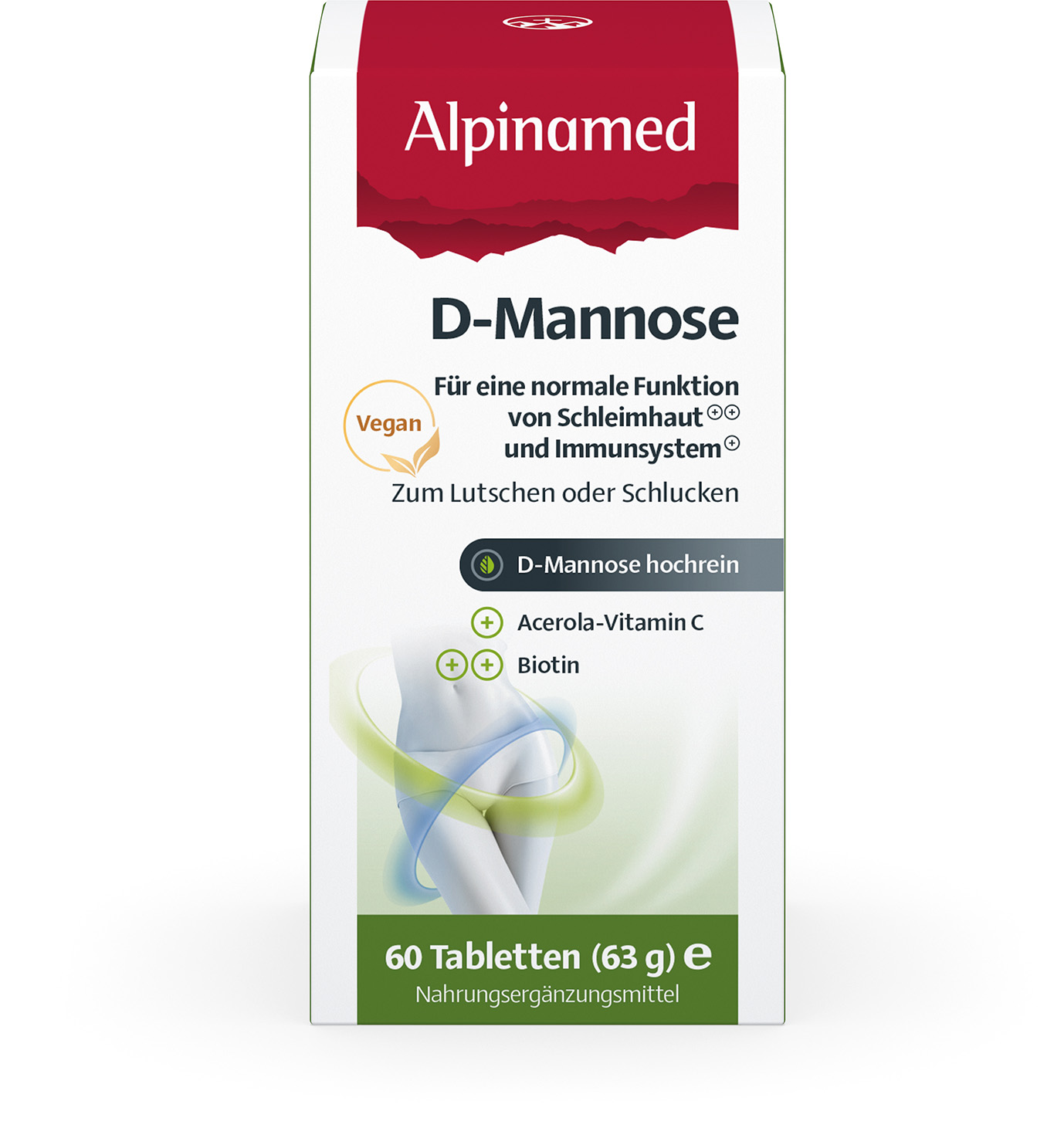 Contrairement aux produits traditionnels à base de D-mannose, ALPINAMED contient en outre de la biotine, qui contribue à la santé des muqueuses. La vitamine C issue de l'acérola contribue à la fonction de défense normale de l'organisme. Les comprimés sont végétaliens, sans gluten ni lactose et ne contiennent ni colorants ni conservateurs.