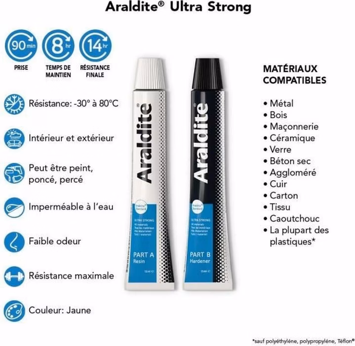 L'ARALDIT Standard convient au collage du métal, du bois, de la maçonnerie, de la céramique, du verre, du béton sec, du cuir, du carton, du tissu, du caoutchouc ainsi que de la plupart des matières plastiques (sauf PE, PP, Téflon). Avec sa couleur blanche, elle convient pour des applications à l'intérieur et à l'extérieur.