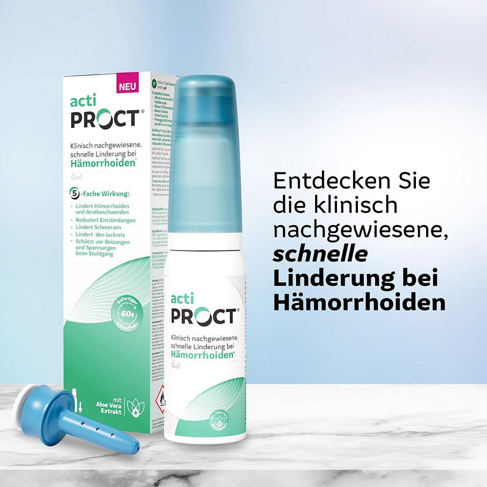 ActiProct® Gel avec applicateur est un traitement testé cliniquement qui soulage immédiatement les hémorroïdes et les douleurs anales. La formule gel innovante à l'aloe vera a un effet rafraîchissant, apaisant et protège la peau sensible - idéal pour le traitement et la prévention.