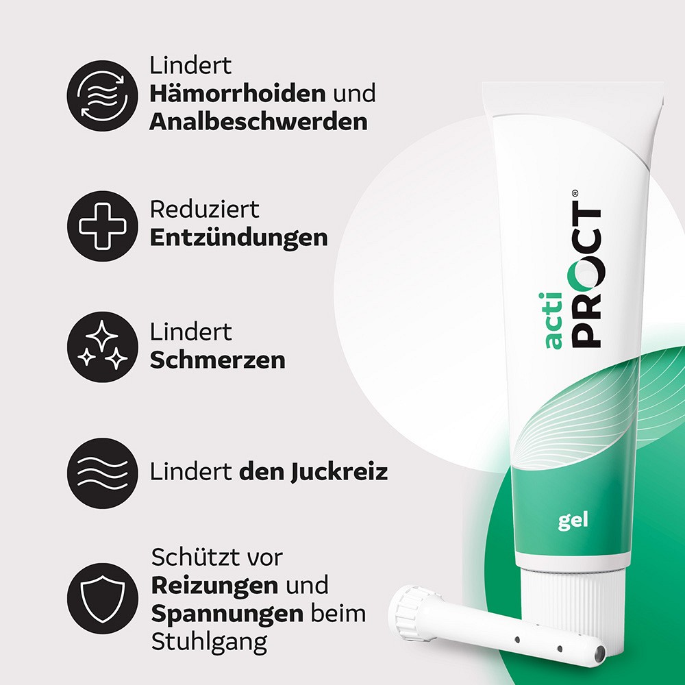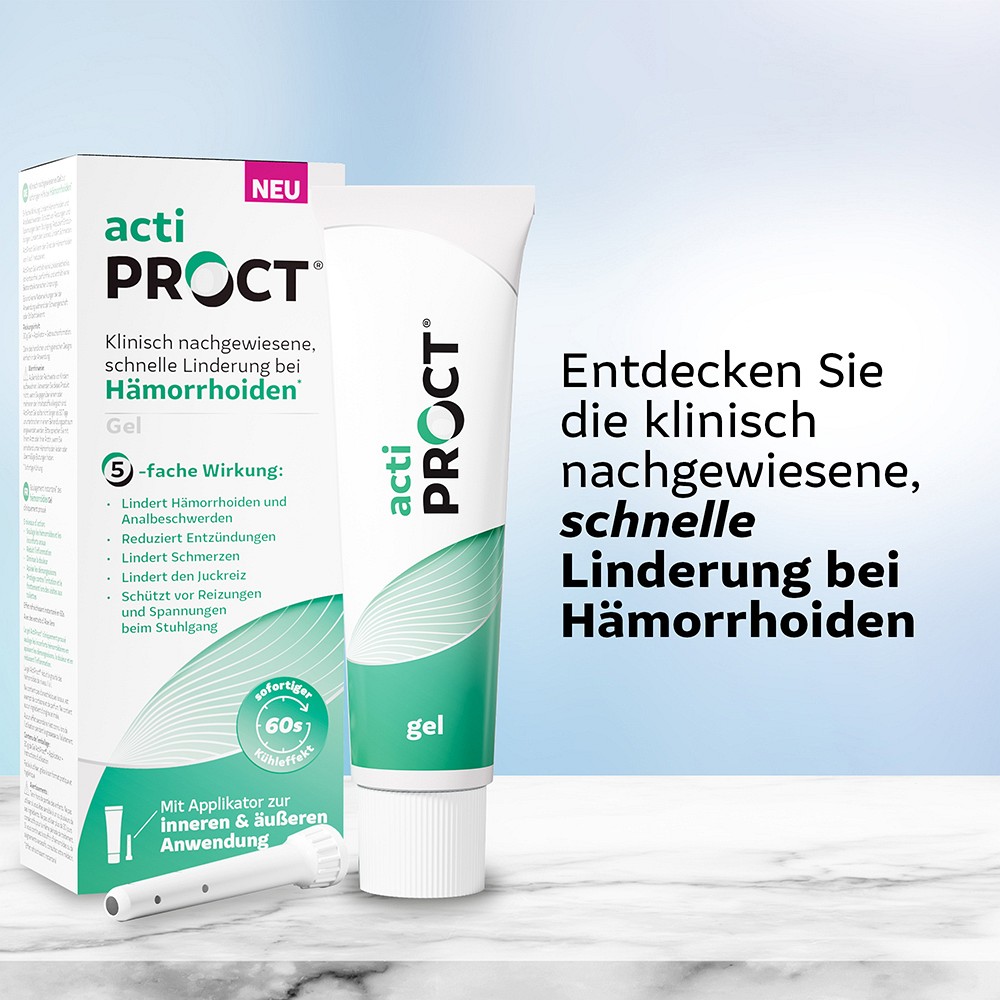 ActiProct Gel est un gel médical destiné à soulager les hémorroïdes, les fissures et les douleurs anales. Grâce à son action unique en 5 points, il offre un confort rapide - interne et externe - et peut réduire la sévérité des hémorroïdes de manière cliniquement prouvée.