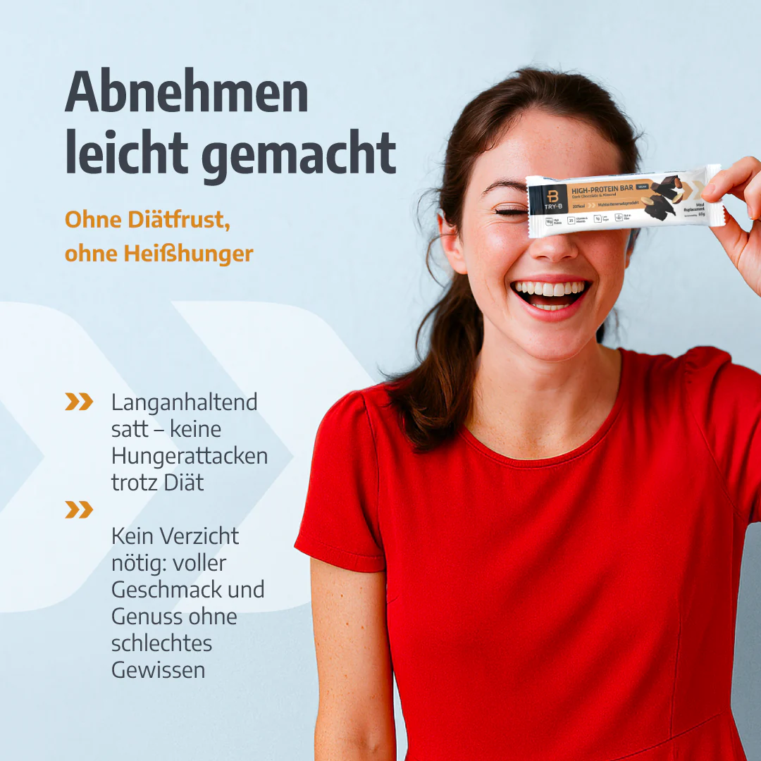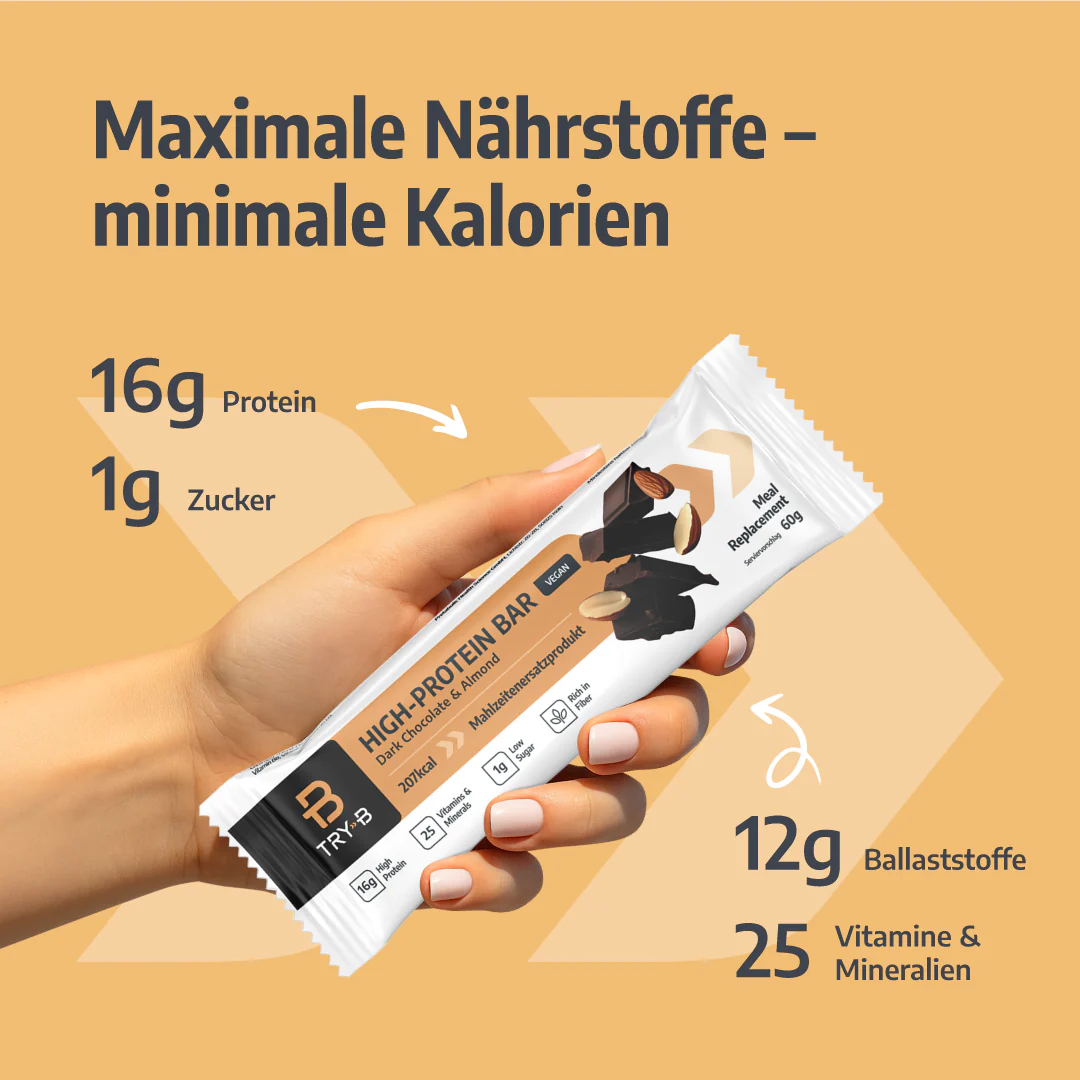 La rencontre d'un plaisir délicat et d'une alimentation saine : les barres TRY-B Dark Chocolate & Almond t'offrent la combinaison parfaite d'un chocolat noir raffiné et d'amandes aromatiques - un substitut de repas végétalien idéal pour une alimentation de contrôle du poids.