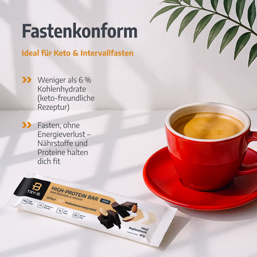 Avec moins de 6 % de glucides et riches en protéines, les barres TRY-B sont conformes au régime céto et au jeûne. Elles fournissent des micronutriments essentiels et sont parfaites pour les personnes qui souhaitent perdre du poids de manière saine, maintenir leur poids ou qui cherchent simplement une alternative équilibrée à emporter.