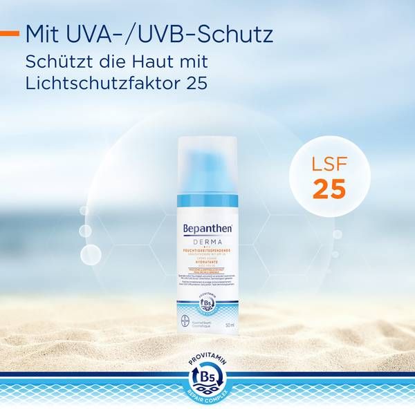 Bepanthen® Derma Crème hydratante pour le visage SPF 25 combine une hydratation intense avec une protection contre les UV et des ingrédients précieux pour une peau entièrement soignée. Idéale pour une utilisation quotidienne en cas de **peau sèche & sensible**.