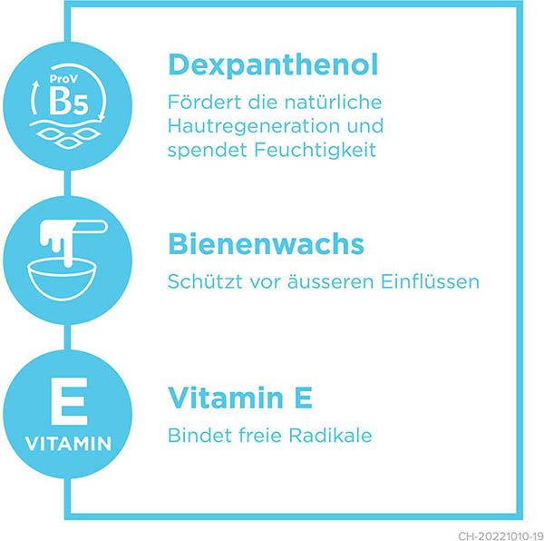 Le dexpanthénol (provitamine B5) qu'il contient favorise la régénération naturelle de la peau tout en l'hydratant intensément. Les lèvres sèches et gercées retrouvent leur beauté et leur souplesse. De plus, la cire d'abeille forme une couche protectrice sur la peau, qui protège des influences extérieures et empêche les lèvres de se dessécher davantage.