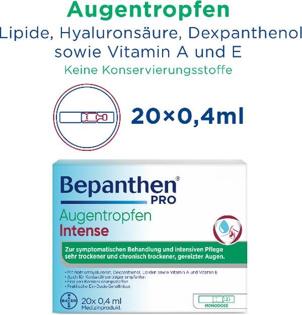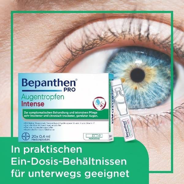 Les yeux sont notre fenêtre sur le monde. Mais des yeux secs et irrités peuvent nuire au bien-être. Bepanthen® Pro Collyre Intense a été spécialement conçu pour le **soin intensif des yeux très secs et chroniquement secs**. Ils aident à régénérer la **couche lipidique du film lacrymal** et offrent une hydratation de longue durée.
