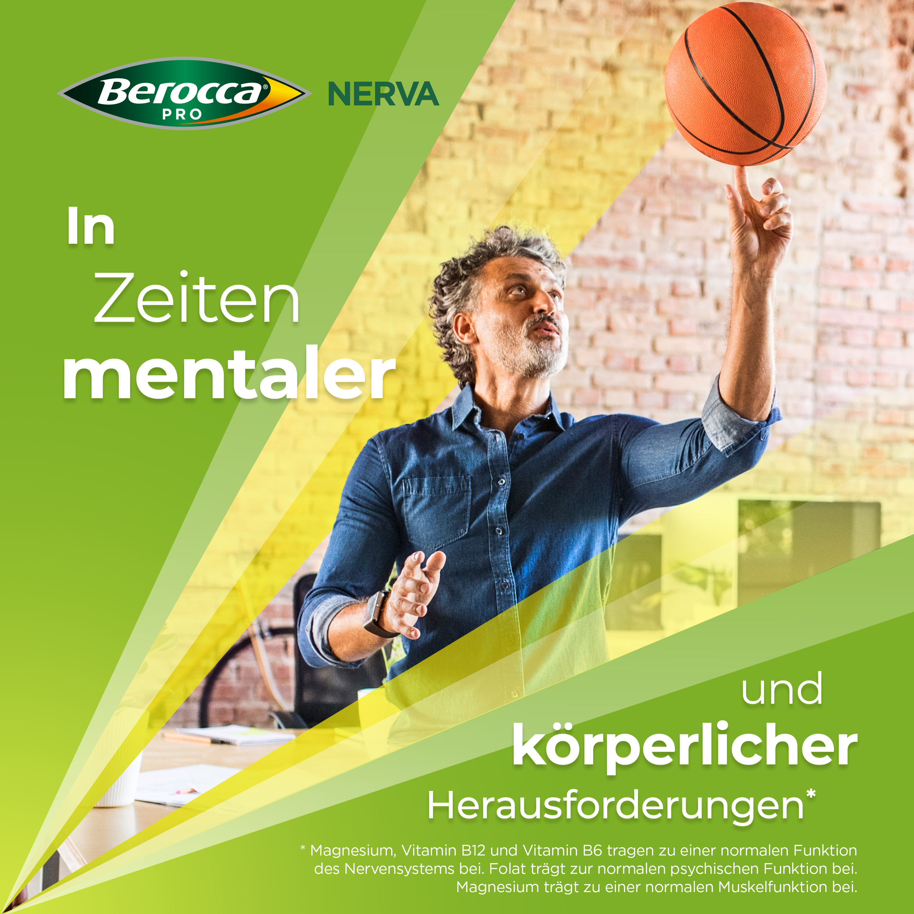 Berocca® Pro Nerva est un complément de haute qualité pour les personnes qui souhaitent avoir confiance en leurs capacités mentales et physiques. Sans lactose, gluten & ingrédients d'origine animale.