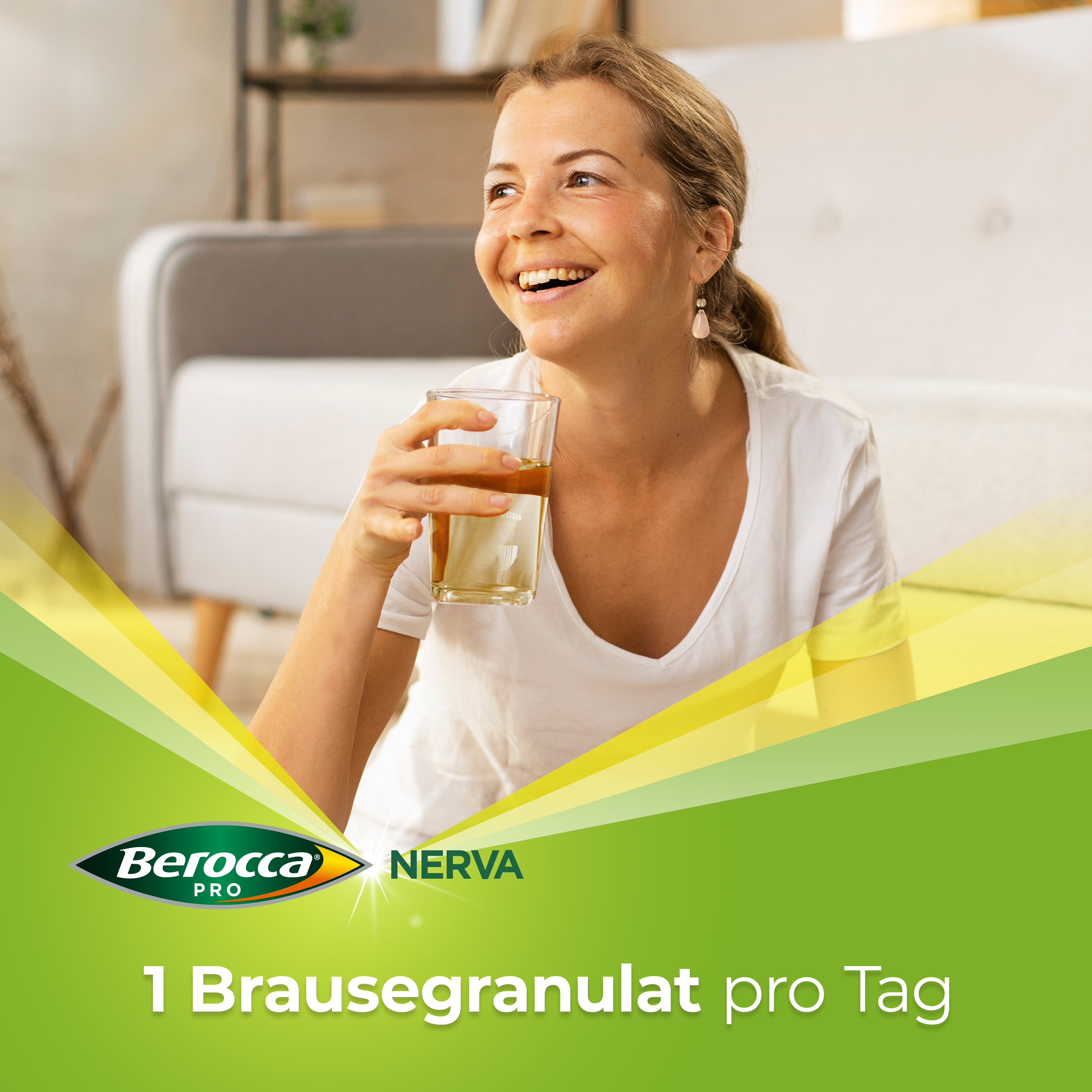 Chaque jour apporte de nouveaux défis. Berocca® Pro Nerva a été spécialement conçu pour soutenir vos nerfs et vos muscles en période de stress mental et physique. Grâce à une combinaison unique de **magnésium, d'extraits de rosier et de mélisse ainsi que de vitamines B sélectionnées**, ces granulés effervescents contribuent au fonctionnement normal des nerfs et des muscles.