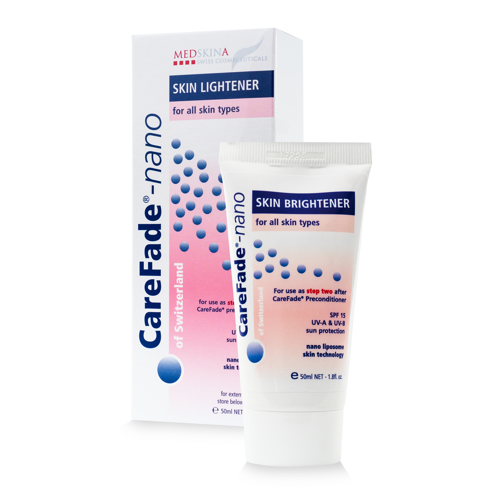 CareFade®-nano Cream est un soin spécial testé dermatologiquement pour l'éclaircissement cosmétique des taches de vieillesse et des hyperpigmentations. La formule synergique nano-biologique innovante combine un extrait de raisin d'ours (Arctostaphylos uva-ursi) éclaircissant la peau dans un complexe de liposomes avec de l'acide hyaluronique, du pentylene comme booster d'hydratation ainsi que des filtres UVA/UVB à large spectre (SPF 20). Résultat : un teint d'apparence plus uniforme, une peau bien hydratée et une protection préventive contre le vieillissement cutané photo-induit.