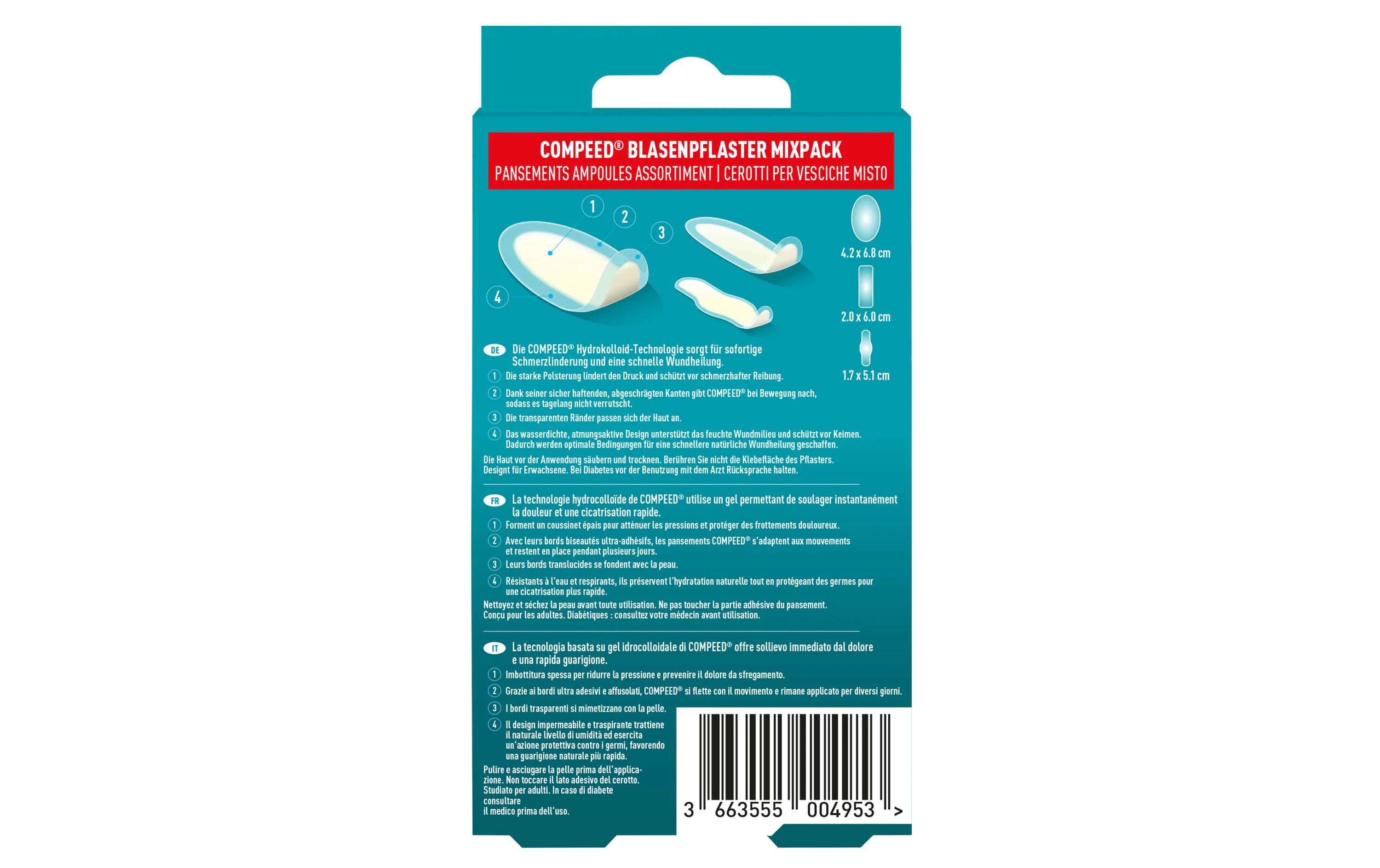 Contient le pansement adapté à chaque ampoule : Compeed® Pansement Ampoule Mixpack est la solution complète pour les ampoules aux pieds.