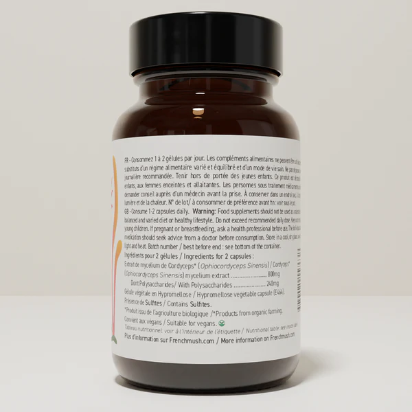 - 100 % d'extrait de cordyceps bio provenant de la fructification.