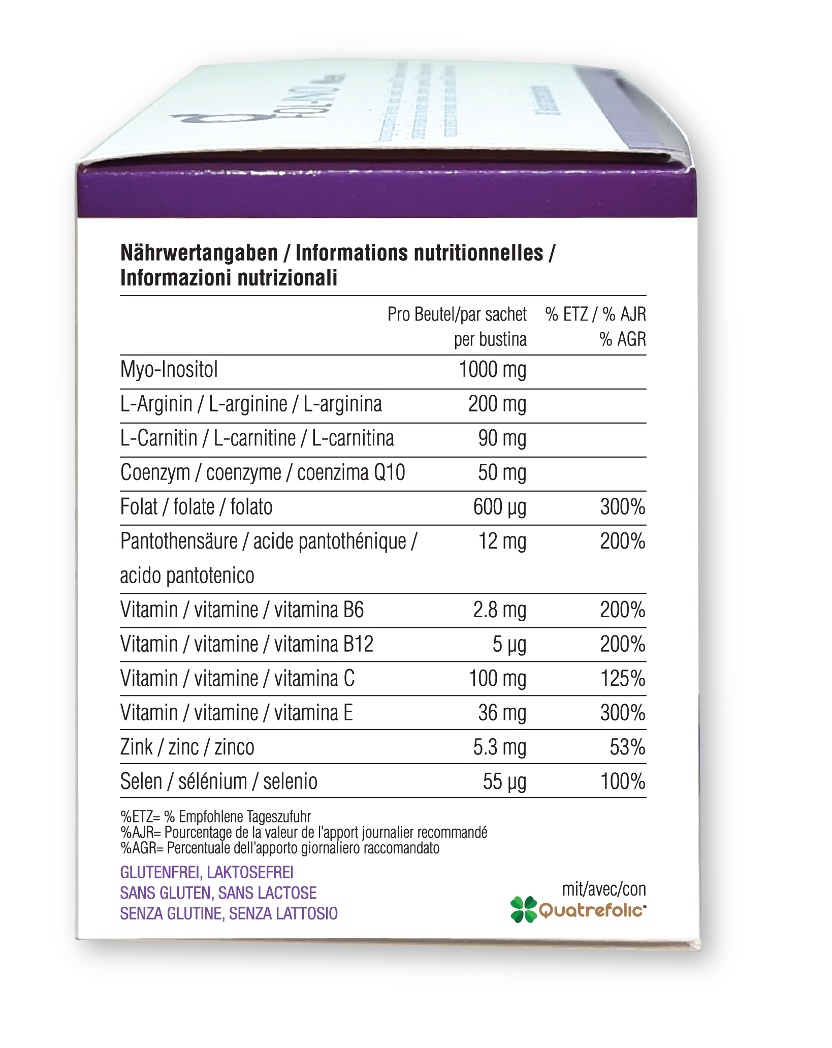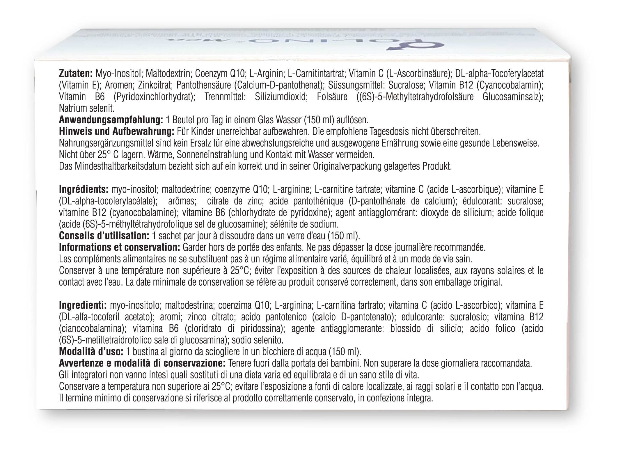 Complément alimentaire avec myo-inositol, L-arginine, L-carnitine, coenzyme Q10, folate, vitamines, minéraux.