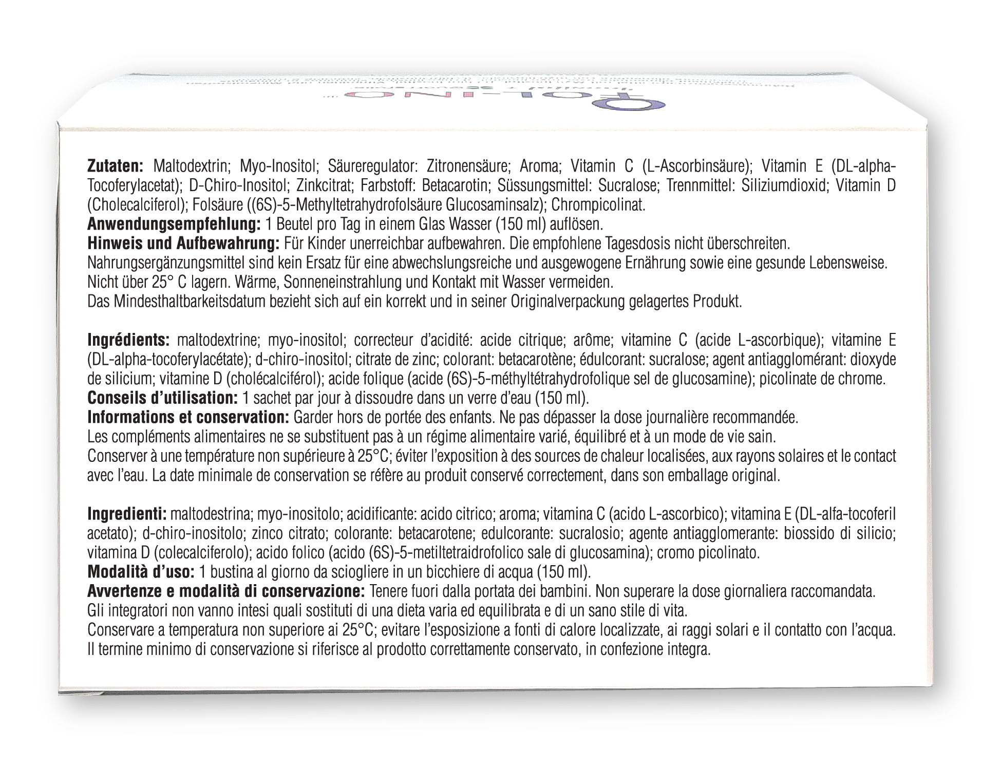 Complément alimentaire contenant du myo-inositol, du D-chiro-inositol, du folate, de la vitamine C, de la vitamine D, de la vitamine E, du zinc et du chrome.