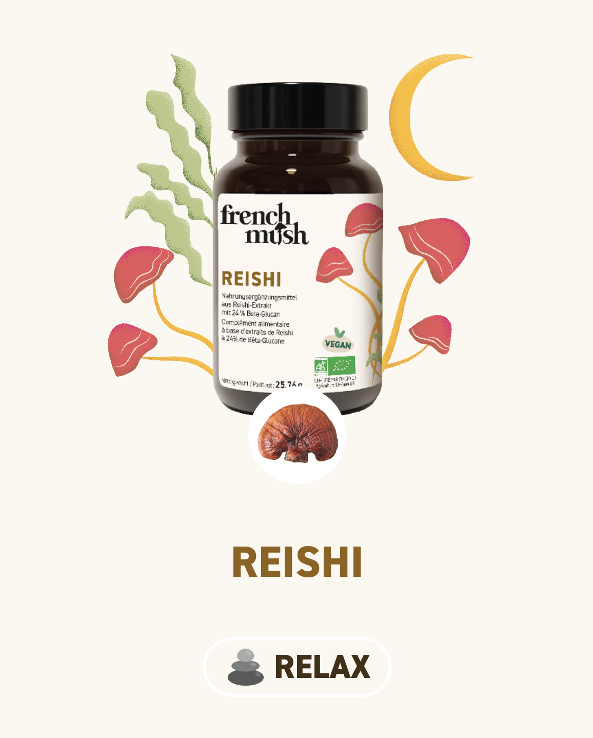 Le reishi est traditionnellement apprécié pour ses propriétés apaisantes. Les triterpènes qu'il contient soutiennent le système nerveux parasympathique et favorisent la détente ainsi qu'un sommeil réparateur. Les bêta-glucanes, des glucides complexes présents dans le reishi, contribuent à soutenir le système immunitaire. Ce champignon est donc idéal pour tous ceux qui recherchent une contribution naturelle à leur bien-être.