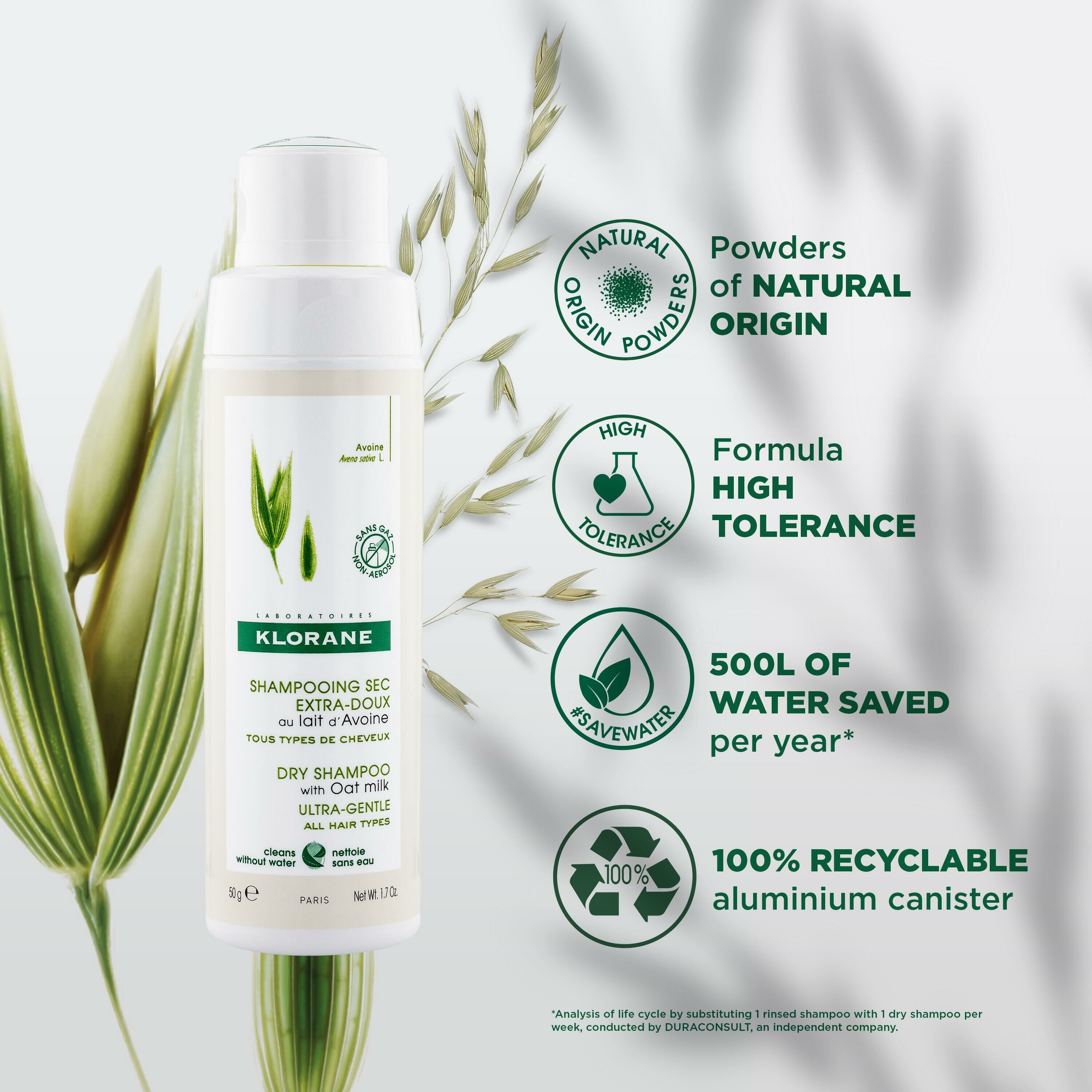 Depuis 1971, le shampooing sec Klorane au lait d'avoine apporte fraîcheur et légèreté entre les lavages tout en économisant de l'eau.