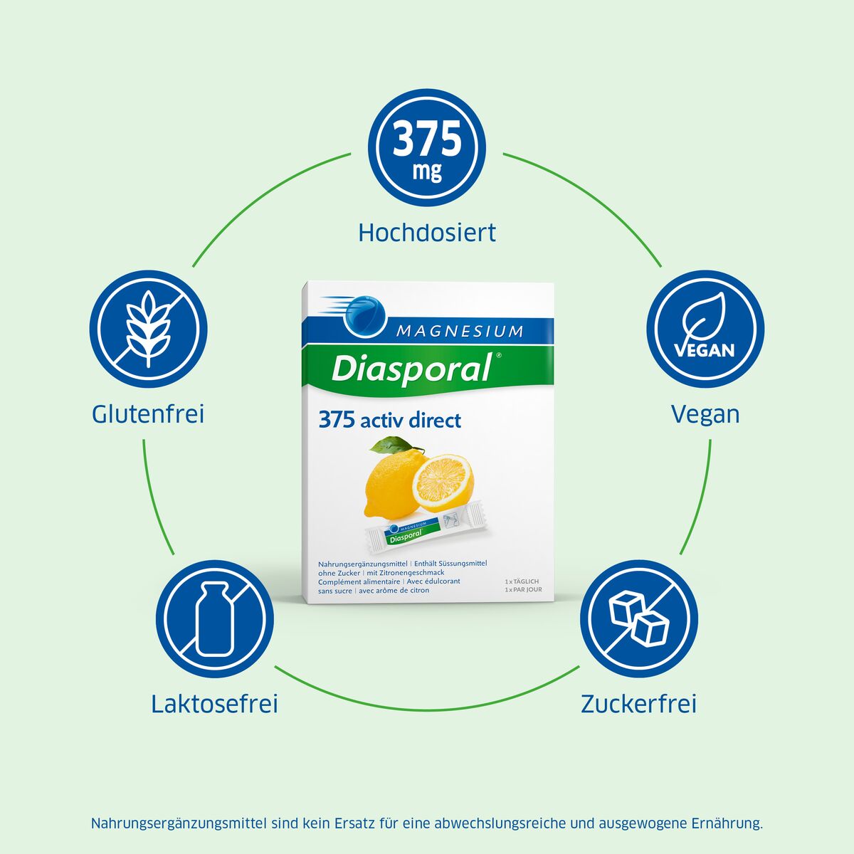 Un seul stick Magnesium-Diasporal® 375 activ Direct par jour fournit à votre corps 375 mg de magnésium et contribue à couvrir des besoins accrus.
