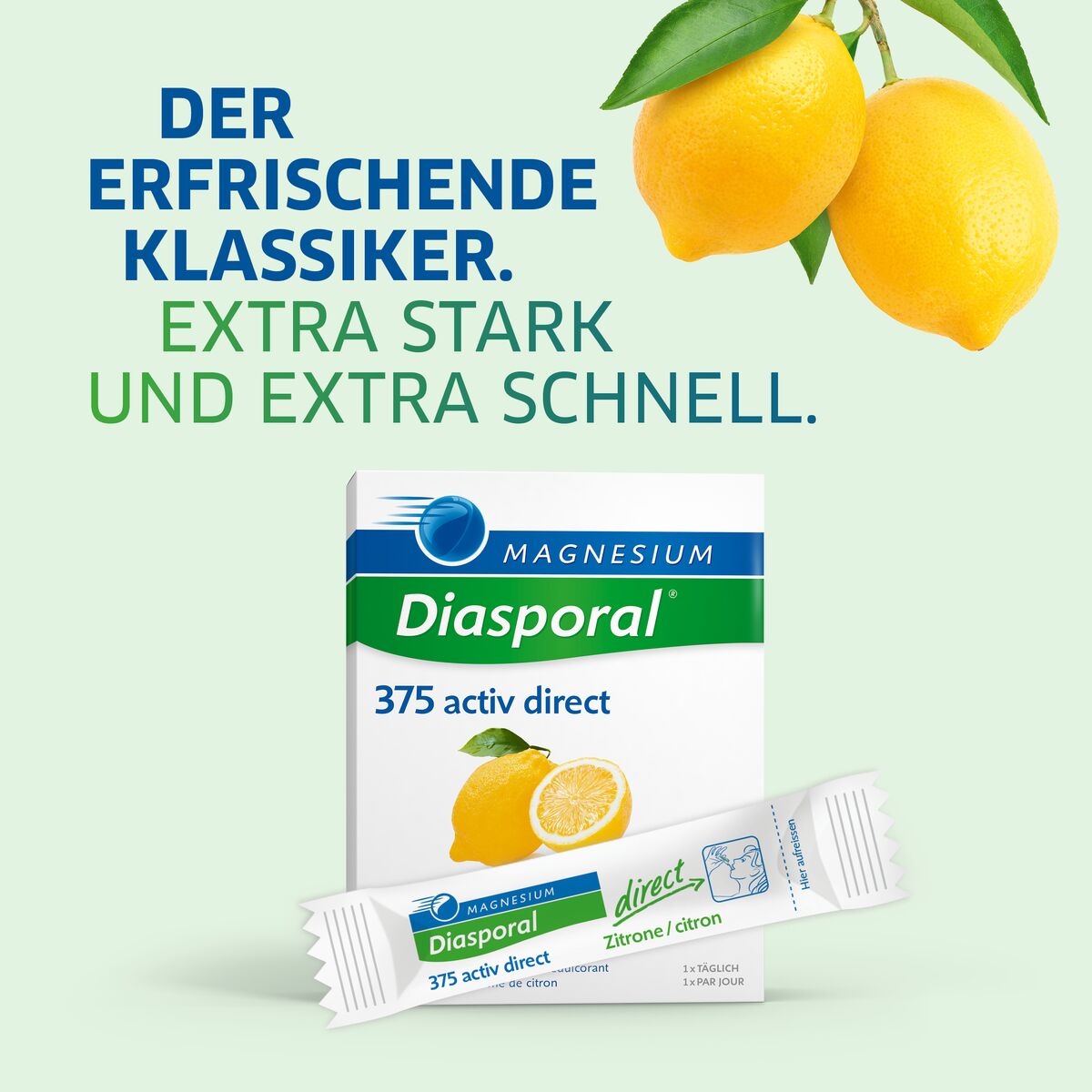 Les granulés directs se dissolvent en quelques secondes et peuvent être pris sans liquide. Le goût frais de citron rend la prise agréable et rafraîchissante. Magnesium Diasporal Activ Direct contient du citrate de magnésium et de l'oxyde de magnésium, deux formes de magnésium bien biodisponibles qui sont utilisées efficacement par l'organisme.