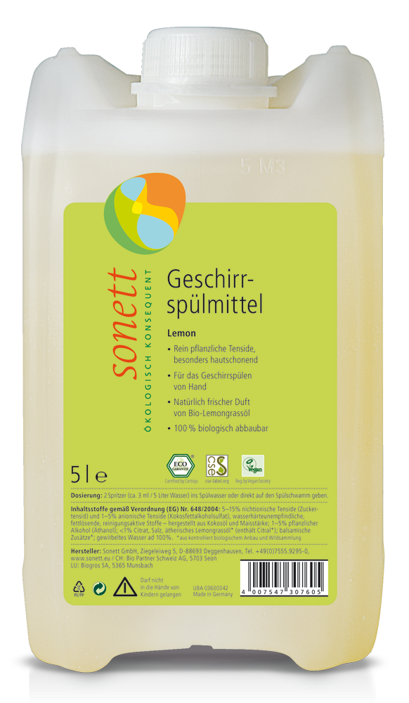 Avec le liquide vaisselle Sonett, la vaisselle est propre comme un sou neuf - sans aucun produit chimique agressif. Il est doux pour la peau, écologique et biodégradable.