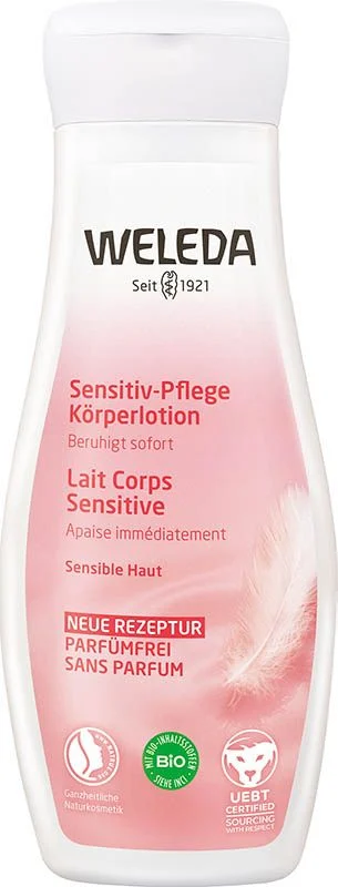 WELEDA Körperlotion Sensitiv Pflege 200 ml – Sanfte Pflege für empfindliche Haut Die WELEDA Körperlotion Sensitiv Pflege ist eine parfümfreie Pflegelotion, die speziell für empfindliche und sensible Haut entwickelt wurde. Sie unterstützt die natürliche Hautbarriere, spendet intensive Feuchtigkeit und trägt dazu bei, Hautirritationen und Spannungsgefühle zu mildern. Mit ihrer leichten Textur lässt sie sich angenehm auftragen und ist ideal für die tägliche Körperpflege nach dem Duschen oder Baden. Die Lotion basiert auf sorgfältig ausgewählten natürlichen Inhaltsstoffen. Mandelöl wirkt beruhigend und harmonisierend, während Jojobaöl und Kokosöl der Haut Geschmeidigkeit verleihen. Pflanzliche Öle wie Borretschöl und Squalan tragen zur Regeneration der Haut bei und fördern ein angenehmes Hautgefühl. Dank ihrer sanften Formel eignet sich die Lotion besonders für sensible Hauttypen und sorgt für ein gepflegtes, ausgeglichenes Hautbild. Eigenschaften der WELEDA Körperlotion Sensitiv Pflege: Parfümfrei und dermatologisch getestet Spendet Feuchtigkeit und unterstützt die Hautbalance Fördert die Geschmeidigkeit sensibler Haut Mit wertvollem Mandelöl und weiteren pflanzlichen Inhaltsstoffen Geeignet für die tägliche Anwendung NaTrue-zertifizierte Naturkosmetik, hergestellt in der Schweiz Die Lotion wird in einer 200 ml Flasche angeboten und bietet zuverlässige Pflege für empfindliche Haut. Sie ist Teil der Weleda Sensitiv Pflegeserie, die auf Natürlichkeit und Verträglichkeit setzt. Anwendung: Nach dem Duschen oder Baden gleichmässig auf die Haut auftragen und sanft einmassieren. Hinweis: Die Angaben zu den Inhaltsstoffen dienen ausschliesslich zu Informationszwecken. Formulierungen können variieren. Bitte beachten Sie stets die Angaben auf der Produktverpackung.