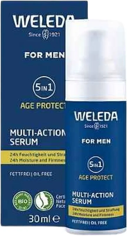 WELEDA FOR MEN Multi-Action Serum 5in1 – Natürliche Pflege für anspruchsvolle Männerhaut Das WELEDA FOR MEN Multi-Action Serum 5in1 vereint klare Einfachheit mit spürbarer Wirkung. Entwickelt für Männer, die eine effiziente und hochwertige Gesichtspflege schätzen, versorgt dieses Serum die Haut intensiv mit Feuchtigkeit, unterstützt ihre Straffheit und fördert ihre Elastizität – Tag für Tag. Die 5in1-Formel basiert auf sorgfältig ausgewählten, natürlichen Inhaltsstoffen. Bio-Aloe Vera spendet intensive Feuchtigkeit, Granatapfelsaft wirkt antioxidativ, und Schlehenextrakt schützt die Haut vor oxidativem Stress, auch ausgelöst durch blaues Licht. Das Ergebnis: Die Haut fühlt sich geschmeidiger an, wirkt erfrischt und gepflegt. Unterstützt ein spürbar strafferes Hautbild in 4 Wochen Reduziert das Erscheinungsbild feiner Linien Erhöht messbar den Feuchtigkeitsgehalt innerhalb von 30 Minuten Schützt vor umweltbedingtem, oxidativem Stress Leichte, fettfreie Textur zieht schnell ein Die Anwendung ist einfach: Morgens und abends eine kleine Menge sanft in die gereinigte Gesichtshaut einklopfen. Für noch mehr Pflege bei trockener Haut empfiehlt sich die Kombination mit der WELEDA FOR MEN Feuchtigkeitscreme. Dieses zertifizierte Naturkosmetik-Serum ist vegan, NaTrue-zertifiziert und für alle Hauttypen geeignet. Hergestellt in Österreich, vereint es Natürlichkeit, Qualität und Wirksamkeit in einer klaren, modernen Pflegeformel. Inhaltsstoffe (INCI) Water, Alcohol denat., Glycerin, Aloe Barbadensis Leaf Juice, Punica Granatum Fruit Juice, Panicum Miliaceum Seed Extract, Prunus Spinosa Wood Extract, Citric Acid, Xanthan Gum, Fragrance, Limonene, Linalool, Benzyl Benzoate, Geraniol, Citral, Coumarin, Farnesol Produktinformationen Inhalt: 30 ml Darreichungsform: Serum Produkttyp: Gesichtsserum (Kosmetik) Marke: Weleda Hergestellt in: Österreich Eigenschaften: Bio, NaTrue, Vegan Hauttypen: Alle Pflegebedürfnisse: Feuchtigkeit, Straffung, Anti-Aging, Antioxidans