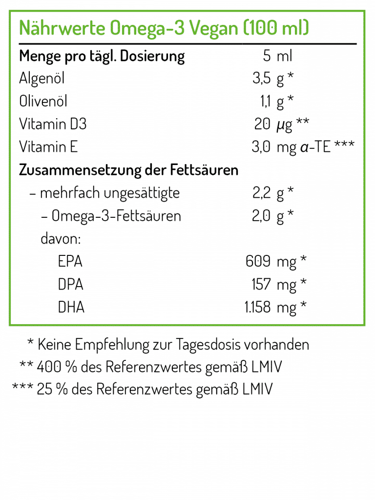 - 2.000 mg d'oméga-3 par dose journalière (1 cuillère à café)