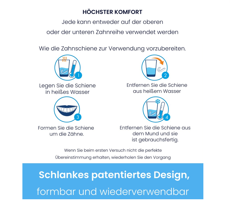 - Contenu : 2 gouttières dentaires, boîte de rangement pratique & instructions en plusieurs langues (DE, EN, FR, IT, ES)
