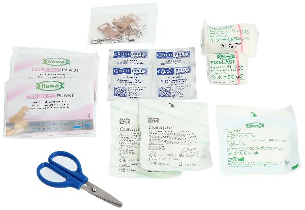 La trousse contient une sélection bien pensée de matériel de pansement de haute qualité pour permettre de prodiguer rapidement les premiers soins aux petites blessures. Les pansements stériles, les bandes de fixation élastiques et les compresses de gaze qu'elle contient sont idéaux pour couvrir et fixer les petites plaies. Le kit est complété par des pansements adhésifs sensitifs en deux tailles, des agrafes de pansement pratiques, des épingles de sûreté ainsi que des ciseaux et des tampons de nettoyage pour une préparation hygiénique de la peau.