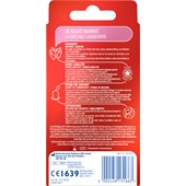 Remarques : Pour une utilisation optimale, les préservatifs Durex ne doivent être utilisés qu'en combinaison avec du gel lubrifiant. Pour le sexe anal, il est recommandé d'utiliser du gel lubrifiant supplémentaire sur la face extérieure du préservatif (pas Durex Prickelnd). Les préservatifs ne doivent jamais être jetés dans les toilettes.