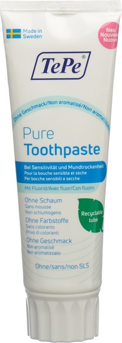 Le dentifrice TePe Pure sans goût 75 ml offre un soin particulièrement doux pour les bouches sensibles et sèches. Ce dentifrice a été spécialement conçu pour répondre aux besoins des personnes ayant des bouches sensibles.