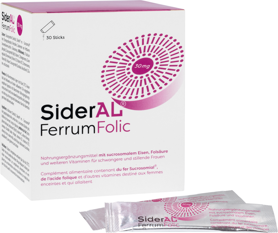 SiderAL® Ferrum Folic est un complément alimentaire contenant du fer sucrosomal, de l'acide folique et d'autres vitamines pour les femmes enceintes et allaitantes.