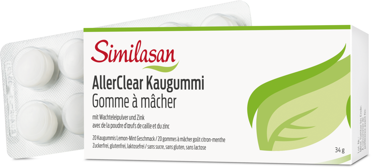 Un bon système immunitaire est important pendant la saison des pollens. Similasan AllerClear chewing-gum est un complément alimentaire contenant du zinc et de la poudre d'œuf de caille.