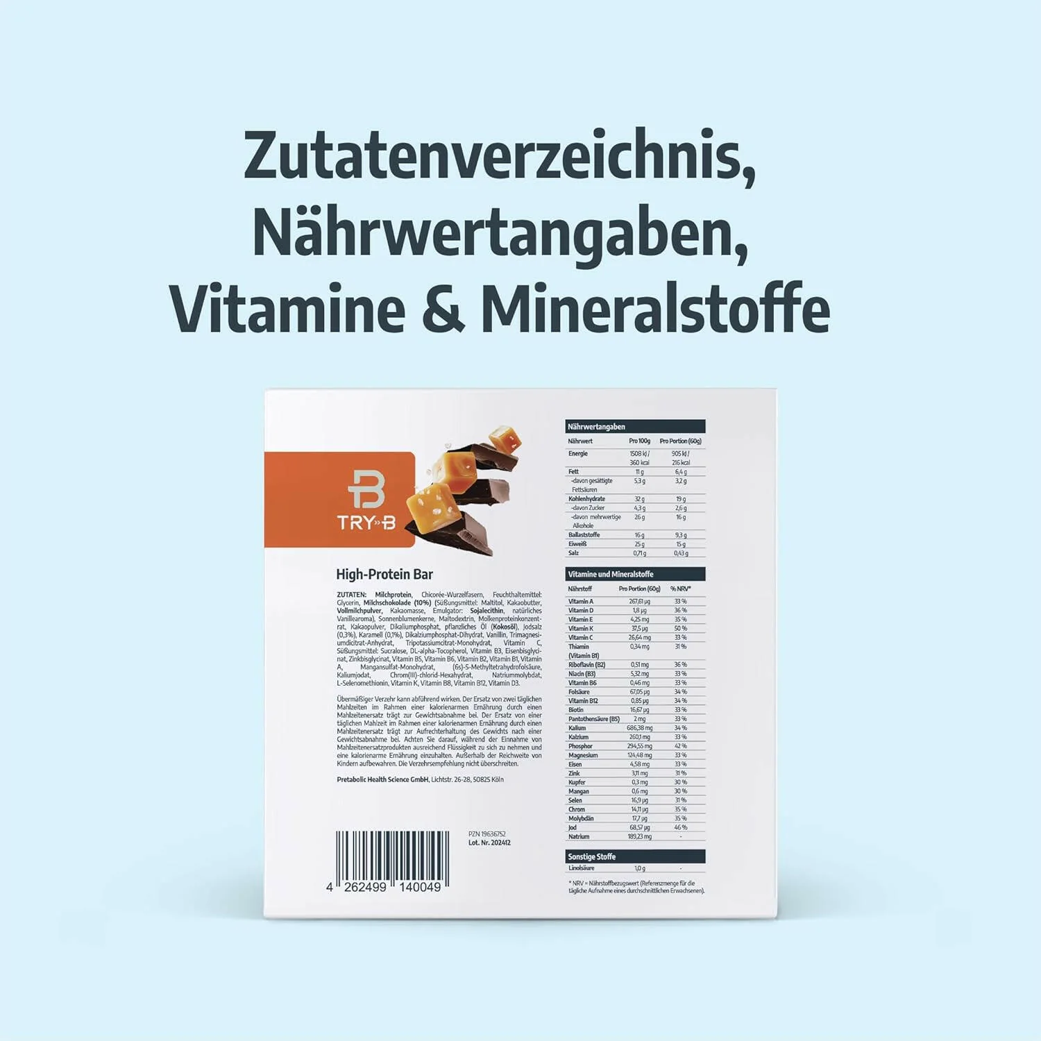 TRY-B est le concept alimentaire moderne pour une réduction de poids durable - sans renoncement ni stress lié au régime. La barre TRY-B Chocolate Salted Caramel allie un délicieux goût de chocolat à une fine note de caramel salé et offre une solution idéale pour tous ceux qui souhaitent perdre du poids ou le maintenir efficacement - confortablement au quotidien.