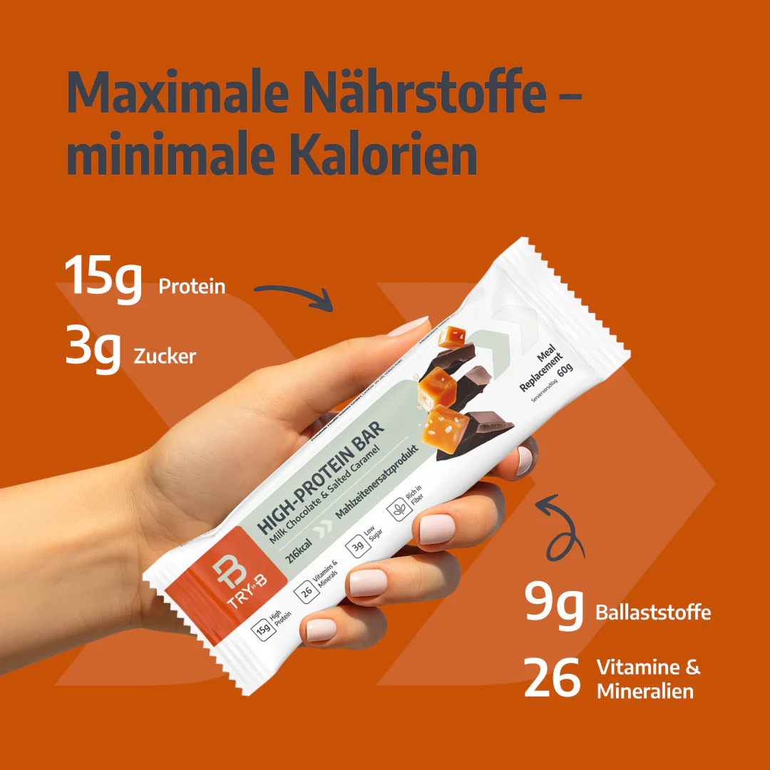 TRY-B est le concept alimentaire moderne pour une réduction de poids durable - sans renoncement ni stress lié au régime. La barre TRY-B Chocolate Salted Caramel allie un délicieux goût de chocolat à une fine note de caramel salé et offre une solution idéale pour tous ceux qui souhaitent perdre du poids ou le maintenir efficacement - confortablement au quotidien.