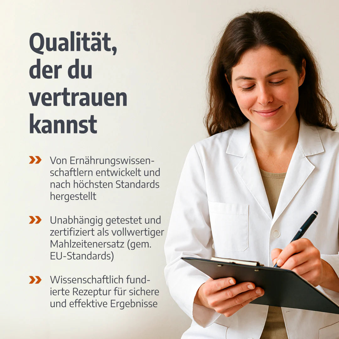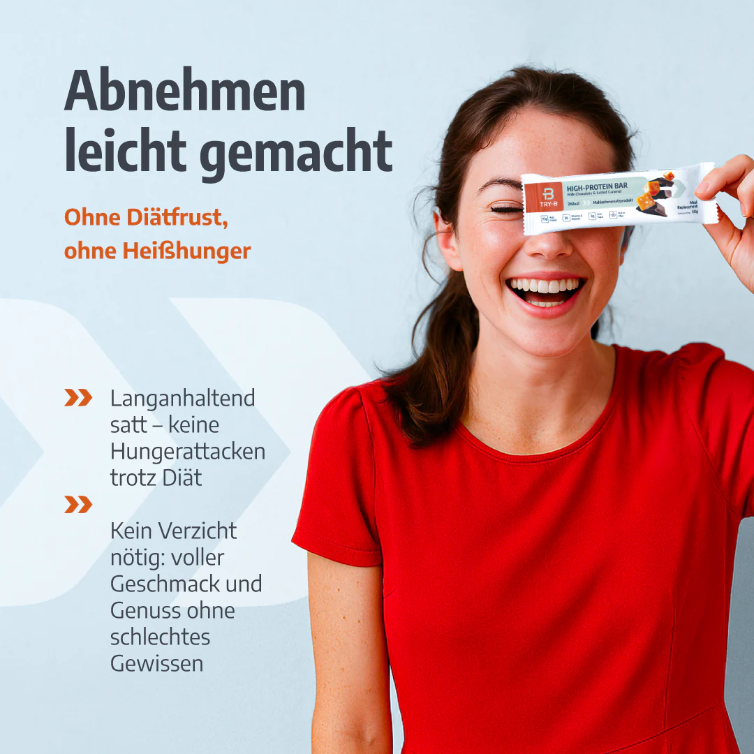 Dans le concept TRY-B, la barre te soutient dans la phase de démarrage en plus du concentré TRY-B. Pendant la phase de réduction, tu peux consommer deux barres TRY-B ou un repas riche en protéines par jour - pour un déficit calorique efficace et des résultats tangibles. Même indépendamment du concept, les barres peuvent être utilisées de manière flexible comme substitut de repas.