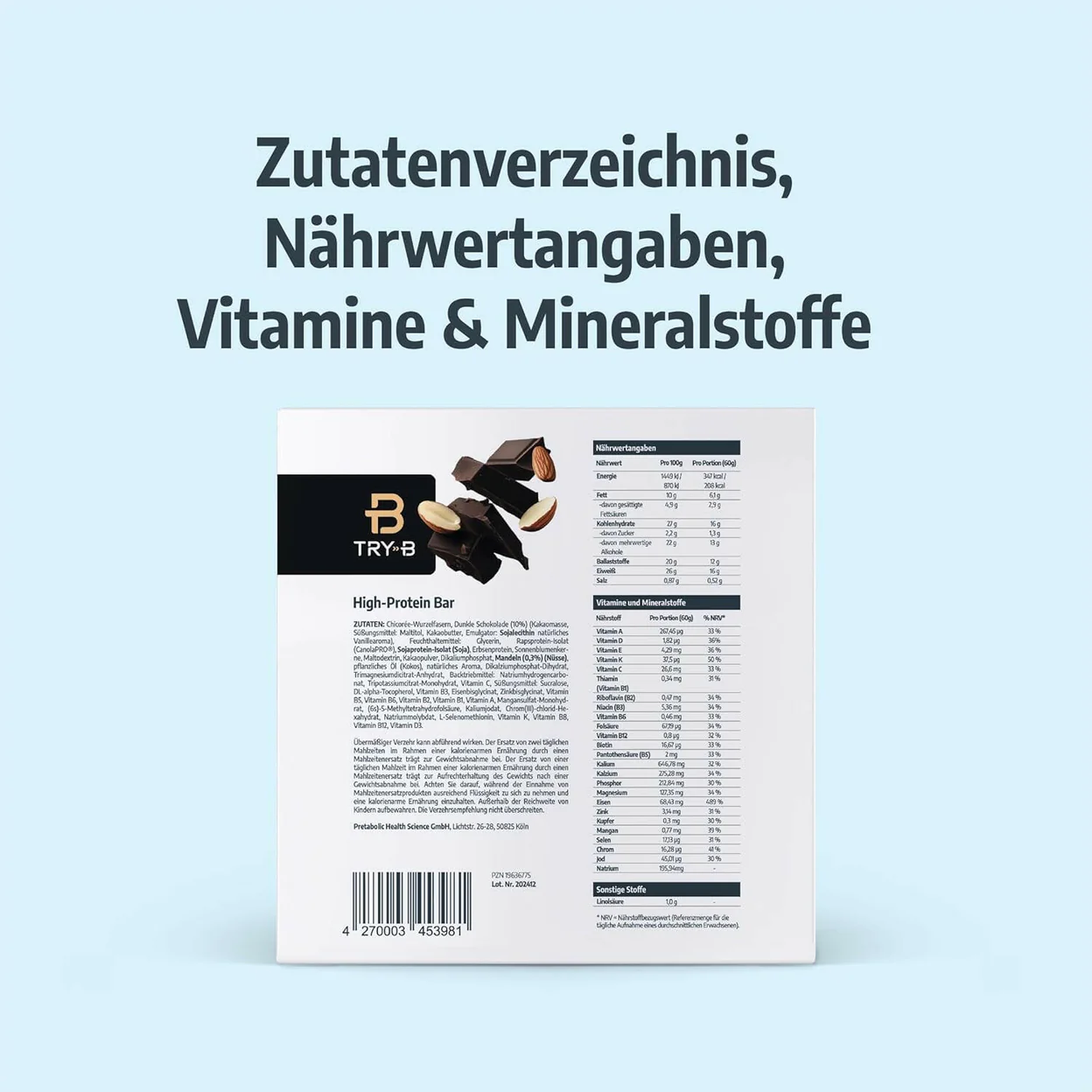 Un plaisir délicat rencontre une alimentation saine : les barres TRY-B Dark Chocolate & Almond t'offrent la combinaison parfaite de chocolat noir raffiné et d'amandes aromatiques - un substitut de repas végétalien idéal pour une alimentation de contrôle du poids.