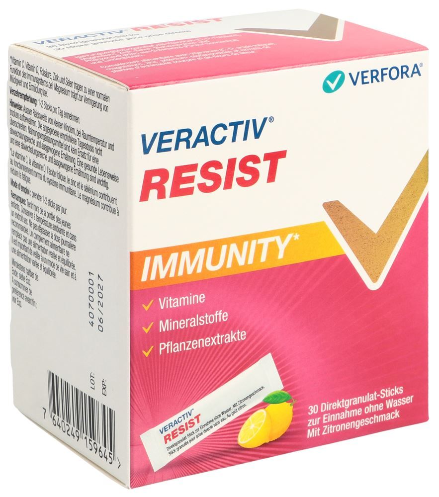 Veractiv® Resist est un complément alimentaire innovant spécialement conçu pour soutenir le système immunitaire grâce à des nutriments essentiels et des extraits de plantes éprouvés. Grâce à une sélection unique de vitamines, de minéraux et d'extraits de plantes, Veractiv Resist contribue à renforcer vos défenses immunitaires et à réduire la fatigue - idéal pour l'hiver et en cas d'effort physique.