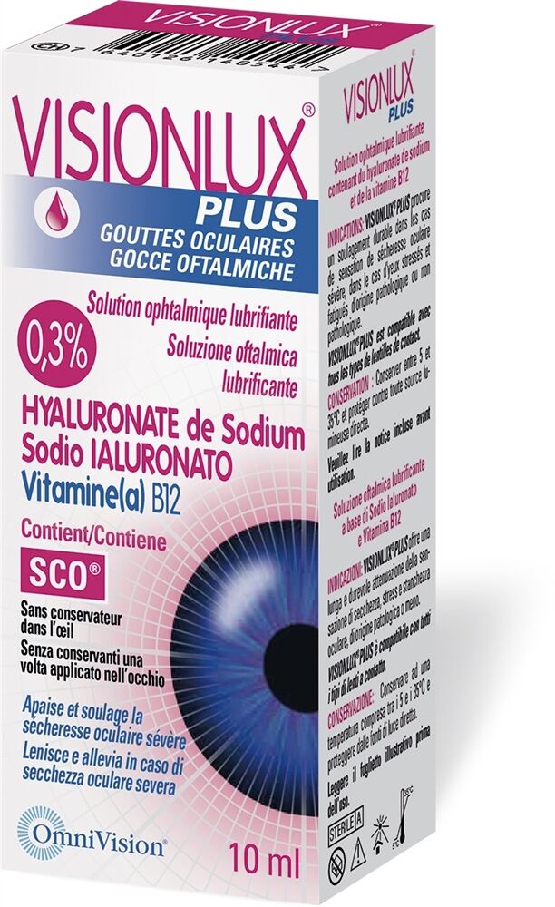 Visionlux Plus ne contient pas de conservateurs et reste stérile jusqu'à 90 jours après l'ouverture grâce à un procédé de stérilisation spécial. Le produit est idéal pour les porteurs de lentilles de contact, car il est compatible avec tous les types de lentilles.