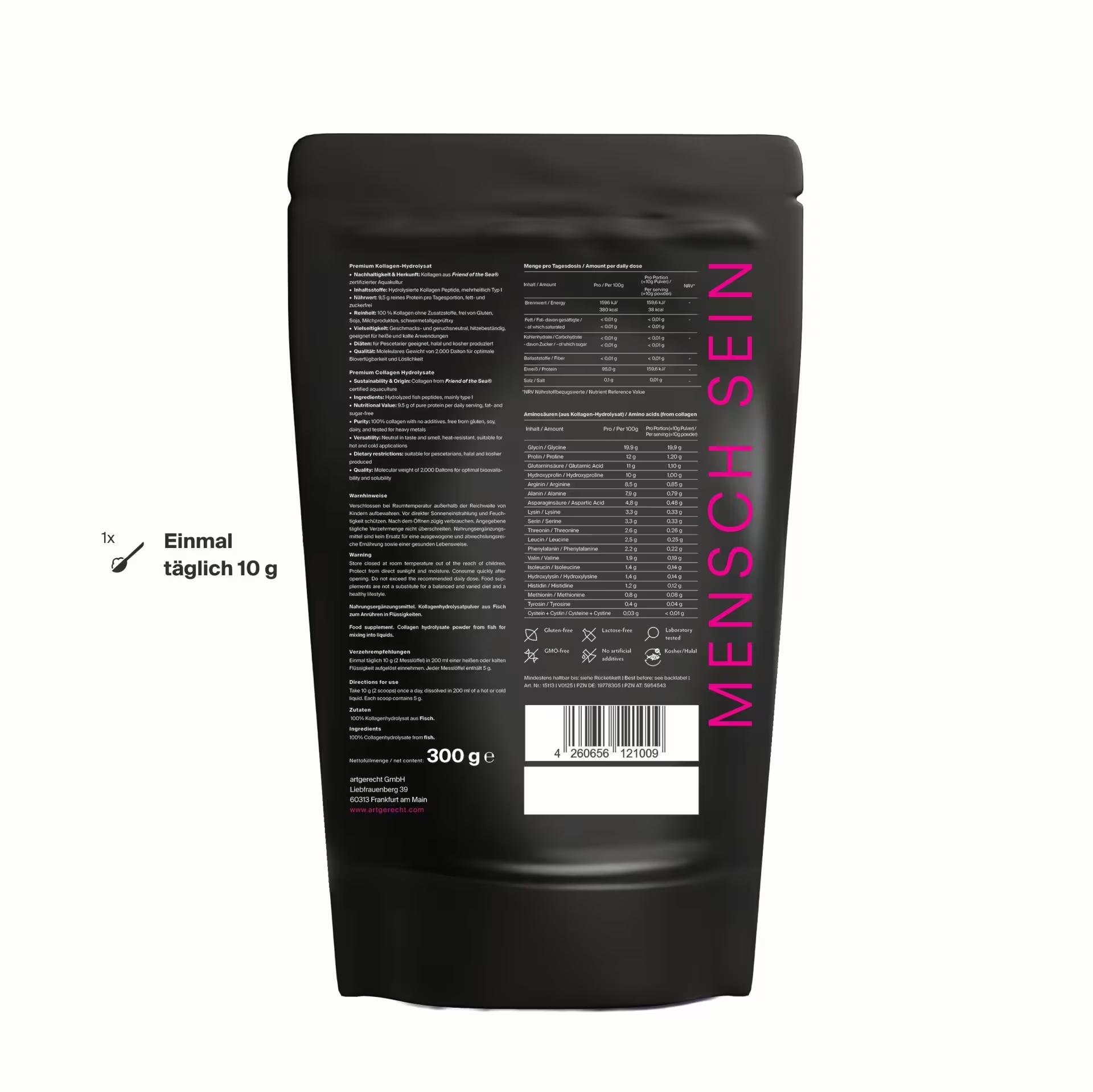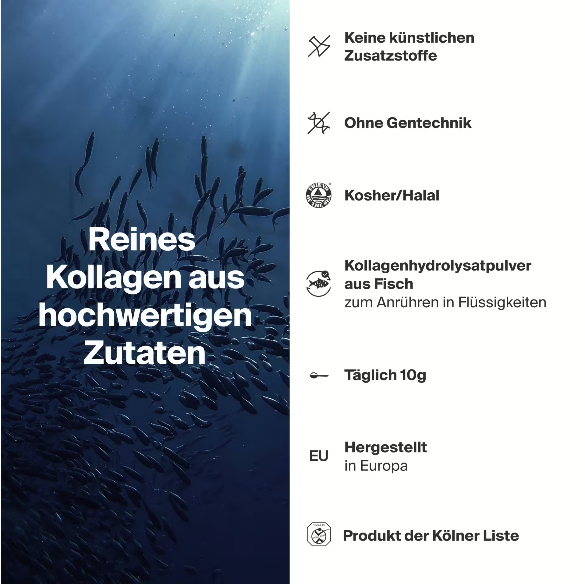 Collagène de poisson (type I & III) obtenu de manière durable, certifié Friend of the Sea®, avec une biodisponibilité optimale (≈ 2 kDa de taille peptidique). Inodore et sans goût, parfaitement soluble - pour les os, les articulations, les muscles & la peau.