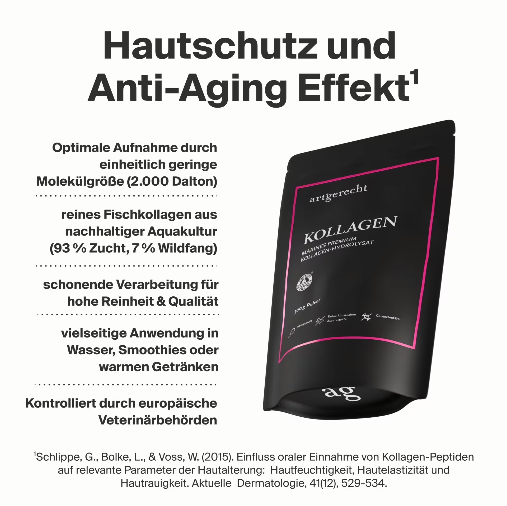 Le collagène est la protéine structurelle la plus fréquente de l'organisme et forme l'ossature de la peau, des os, du cartilage et des tendons. À partir de 25 ans environ, sa synthèse par l'organisme diminue - une supplémentation peut aider à soutenir l'apport en protéines du tissu conjonctif. L'hydrolysat de collagène (~2 kDa) utilisé ici est rapidement absorbé et peut ainsi compléter efficacement l'approvisionnement des structures du tissu conjonctif.