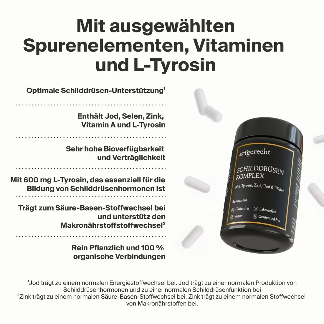 La L-tyrosine constitue, avec l'iode, la base de départ pour la synthèse des hormones thyroïdiennes. Cette combinaison d'oligo-éléments, de vitamines et d'acides aminés fait du complexe thyroïdien un produit holistique pour le métabolisme et la vitalité.