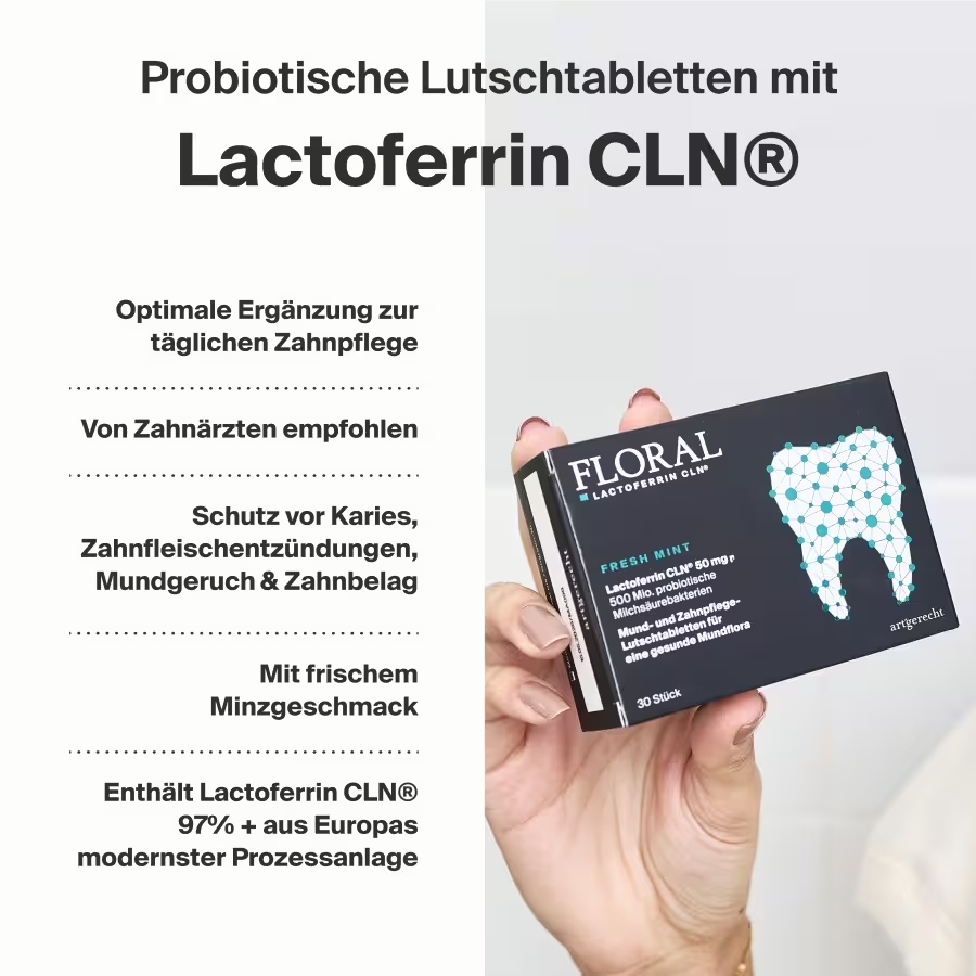 Floral est un complément probiotique pour l'hygiène dentaire et buccale. La combinaison d'AB-Dentalac® et de la lactoferrine CLN® favorise un microbiome oral stable et peut lutter contre la mauvaise haleine.
