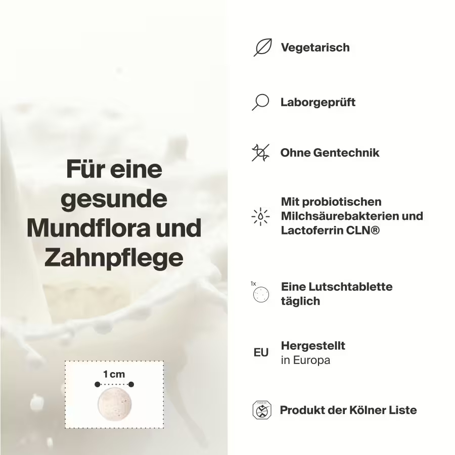 Comprimés à sucer formulés avec Dentalac® - des bactéries lactiques probiotiques (AB-Dentalac®) combinées à la lactoferrine CLN® (hautement purifiée, pureté 98 %) pour une flore buccale soignée et équilibrée.