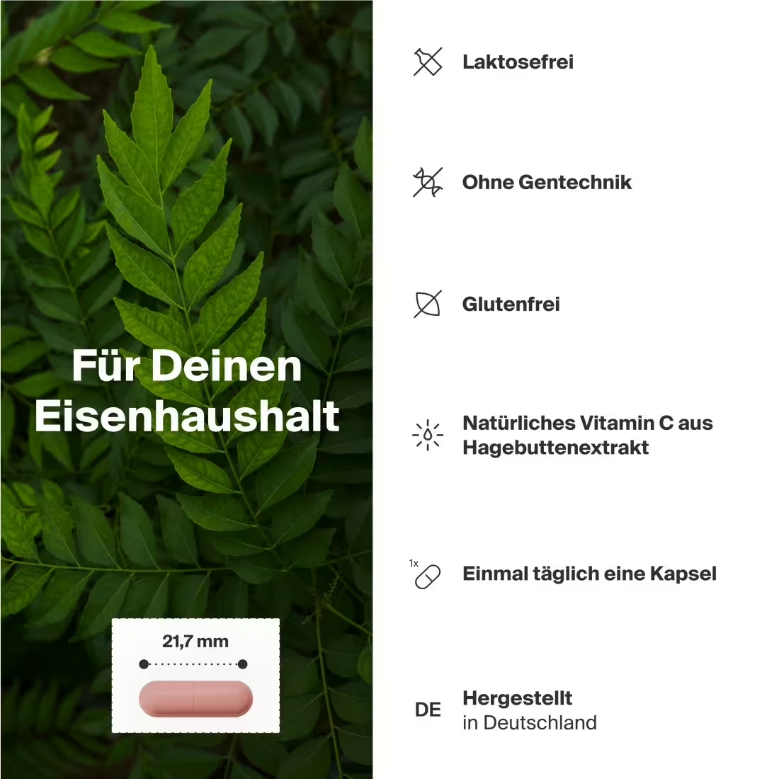 Une gélule par jour avec 150 ml d'eau tiède fournit 100 mg de lactoferrine CLN®, 272 mg d'extrait de feuilles de curry FerroPlant® (dont 3 mg de fer élémentaire, 21,4 % des besoins quotidiens) ainsi que 48 mg d'extrait de cynorrhodon avec 20 mg de vitamine C naturelle. Il est prouvé que le fer contribue à la réduction de la fatigue et de l'épuisement ainsi qu'au fonctionnement normal du système immunitaire