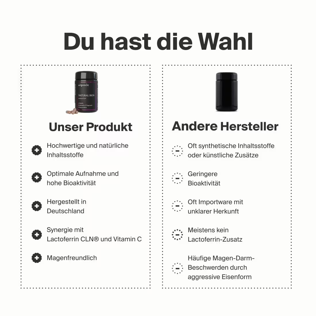 Contrairement aux préparations à base de fer traditionnelles, artgerecht mise sur une combinaison synergique de substances actives : l'extrait végétal de feuilles de curry FerroPlant® fournit du fer organiquement lié provenant de la nature - doux pour l'estomac et exempt de composés de fer (II) synthétiques. La lactoferrine CLN® hautement purifiée - une protéine immunitaire propre à l'organisme - fait office de transporteur naturel de fer et favorise l'absorption et la répartition de l'oligo-élément dans le corps. La vitamine C issue du cynorrhodon augmente en outre l'absorption du fer dans l'intestin
