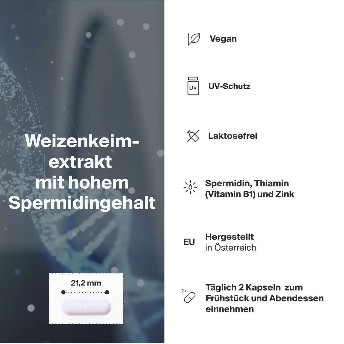 - 2 mg de spermidine par portion journalière (2 gélules) dans un dosage optimal conforme à l'EFSA.