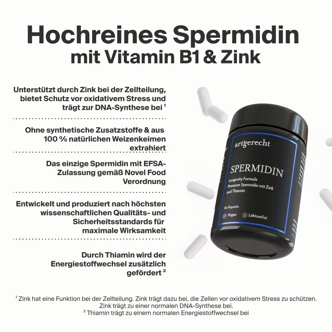artgerecht Spermidin Longevity - 60 gélules | Extrait de germe de blé CelVio® approuvé par l'EFSA avec 2 mg de spermidine, zinc & vitamine B1