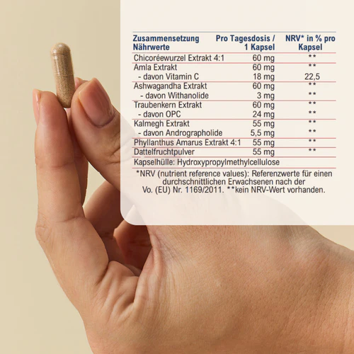 Les plantes utilisées dans VEDI UP sont issues de la tradition ayurvédique millénaire, dans laquelle les plantes amères et les fruits riches en polyphénols sont traditionnellement appréciés pour accompagner les phases de plaisir conscient. La racine de chicorée et le kalmegh comptent parmi les fournisseurs de substances amères les plus connus de la phytothérapie. L'ashwagandha fait partie des plantes les plus appréciées de la tradition ayurvédique. L'extrait de pépins de raisin est riche en polyphénols naturels. La poudre de fruits de dattes fournit des nutriments naturels et complète la recette. VEDI UP combine ces connaissances éprouvées sur les plantes dans une forme de gélule moderne et végétalienne.