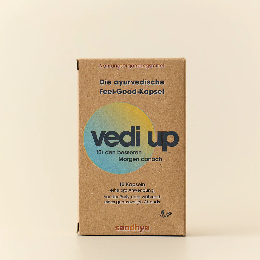Tous les ingrédients de VEDI UP sont obtenus selon des normes de qualité strictes. Le produit est testé en laboratoire, végétalien et ne contient pas d'additifs artificiels. VEDI UP est développé par Sandhya AG en Suisse, une entreprise spécialisée dans les formulations ayurvédiques à base de plantes.